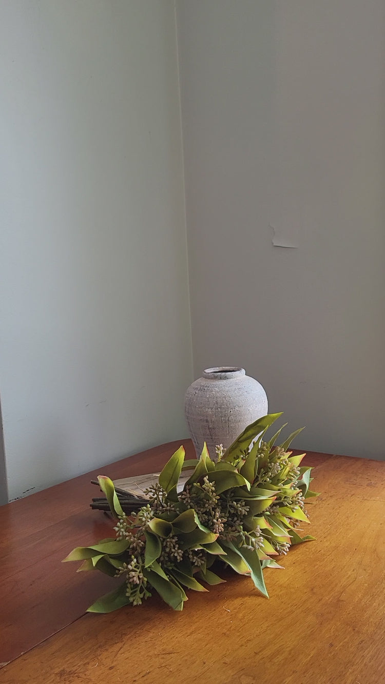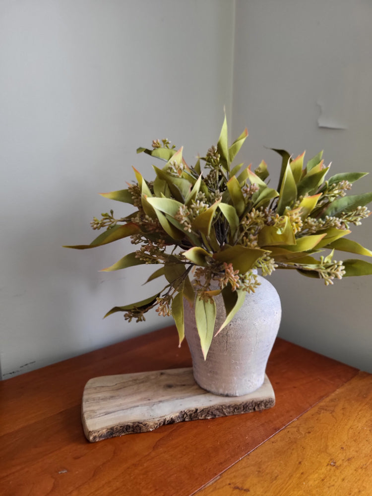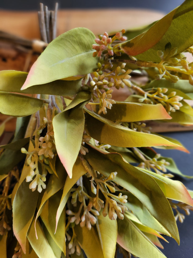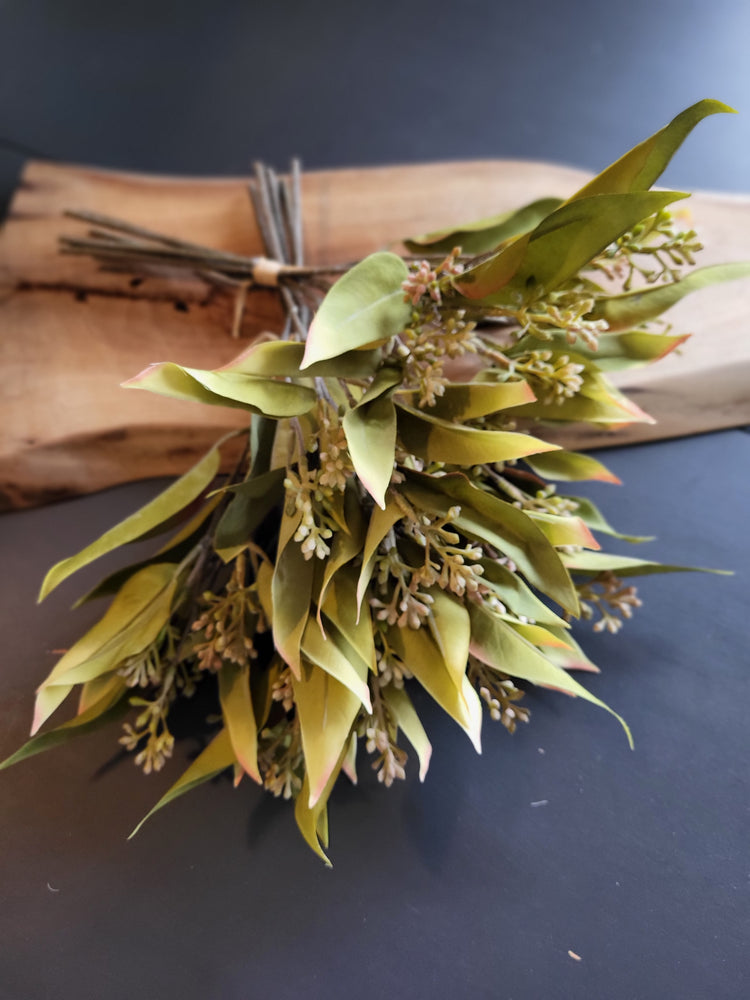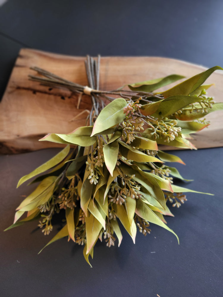 This golden tone faux Eucalyptus is a beautiful accent for vases or in abundance