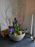 create a beautiful spring planter with violet, crocus, and hyacinth's.
