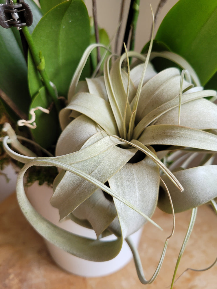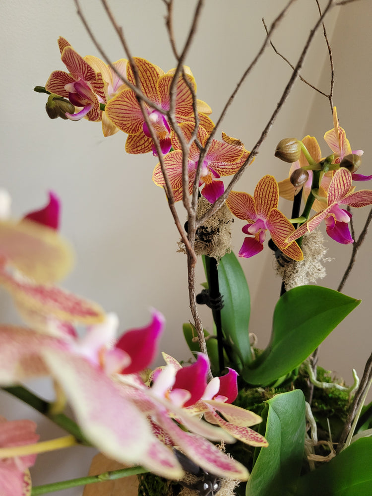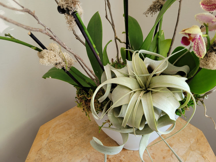 This beautiful collection of 3 mini phalaenopsis orchids is accented with mosses, branches...and air plants!! Learn the art or caring & growing orchids & air plants.